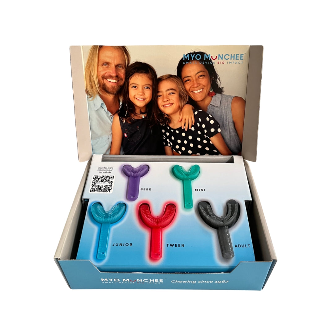 Met slechts 10 minuten dagelijkse kauwoefening kunnen kinderen en volwassenen de tonus en functie van de spieren van de lippen, het gezicht en de kaken verbeteren. De Munchee stimuleert ook lipsluiting, correcte tongplaatsing en slikpatroon en bevordert de neusademhaling.